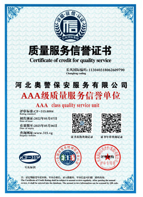 “忠誠的伙伴,非凡的朋友”,河北奧警保安服務有限公司本著“客戶的需求就是我們的追求”的服務理念,與廣大客戶攜手并進、共創恢弘偉業。